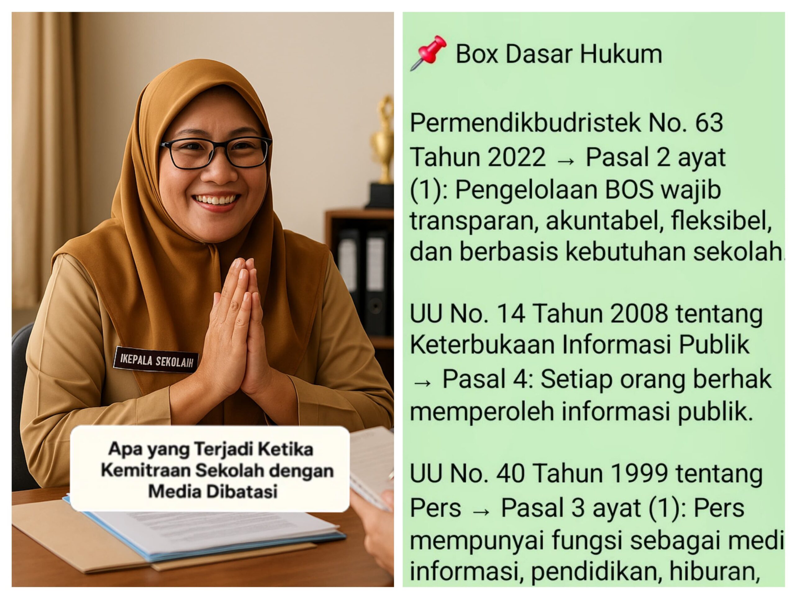 Masalahnya, keputusan itu sama sekali tidak punya dasar hukum. Tidak ada satu pun pasal dalam juknis BOS yang melarang sekolah menjalin kemitraan dengan media. Yang diatur hanyalah larangan penggunaan BOS untuk membiayai iklan komersial atau publikasi berlebihan. Artinya, ruang media untuk hadir sebagai mitra kontrol sosial tetap sah secara hukum.