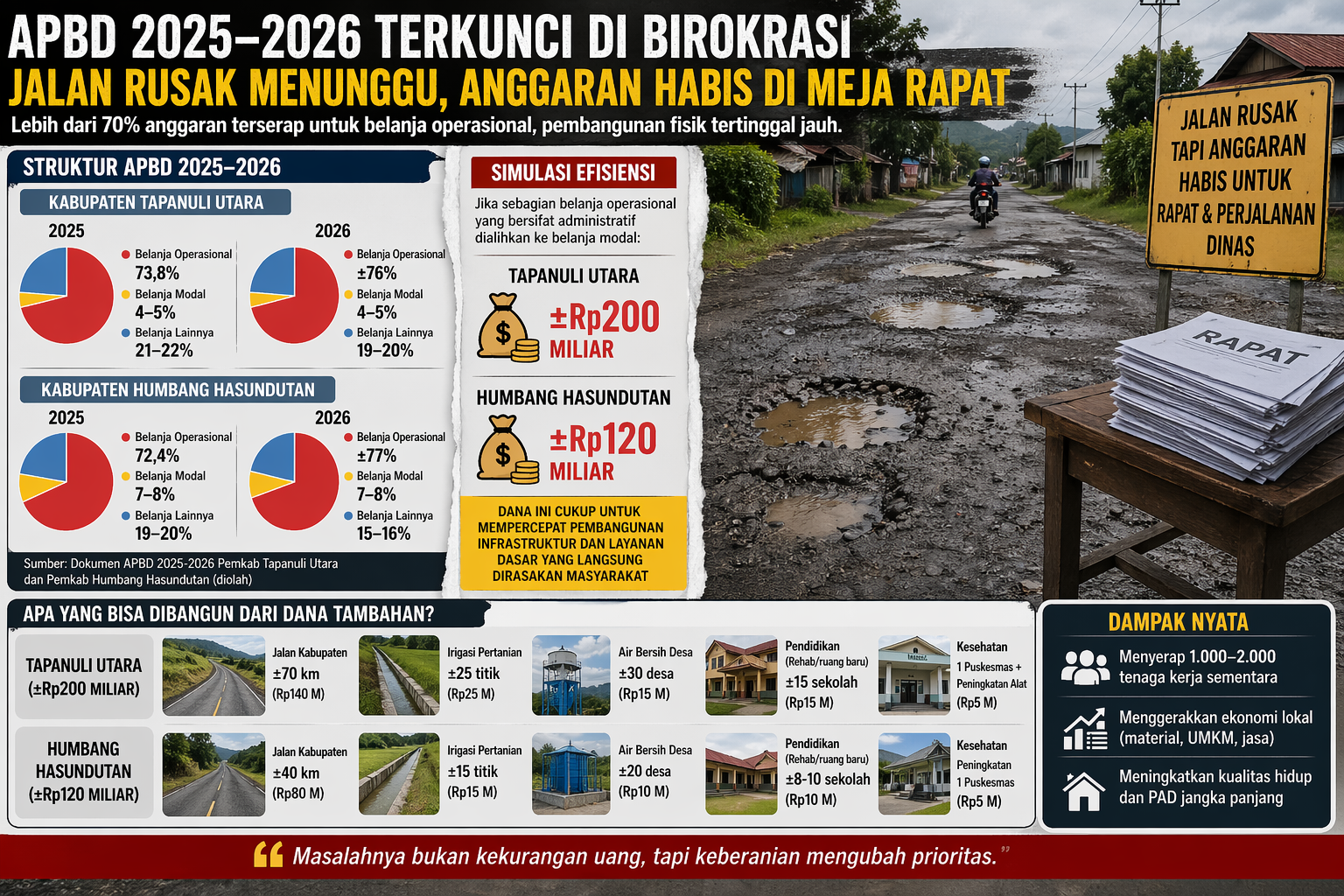 Dalam dua tahun anggaran terakhir, 2025 hingga 2026, struktur APBD di Tapanuli Utara dan Humbang Hasundutan menunjukkan pola yang konsisten: lebih dari 70 persen anggaran terserap untuk belanja operasional. Di sisi lain, pembangunan fisik yang langsung menyentuh masyarakat tetap berada di level rendah. Kondisi ini menimbulkan pertanyaan mendasar—apakah anggaran daerah benar-benar diarahkan untuk kebutuhan publik, atau justru terserap untuk mempertahankan sistem birokrasi itu sendiri?