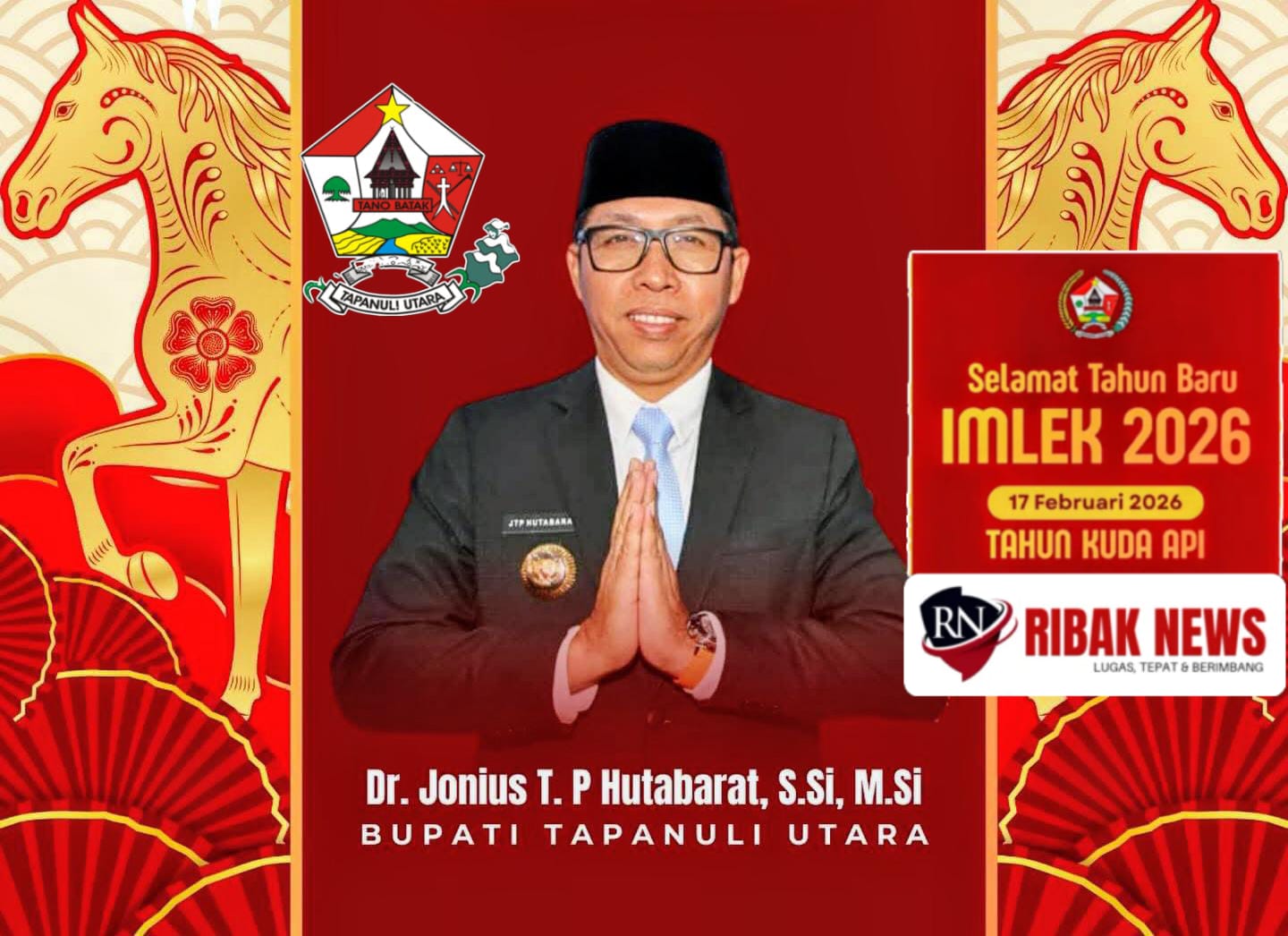Bupati Tapanuli Utara, Jonius T.P. Hutabarat, menyampaikan ucapan Selamat Tahun Baru Imlek 2577 Kongzili yang jatuh pada 17 Februari 2026. Dalam pesan resminya, ia mengajak seluruh masyarakat menjadikan momentum Tahun Kuda Api sebagai semangat baru untuk memperkuat persatuan dan optimisme pembangunan daerah.