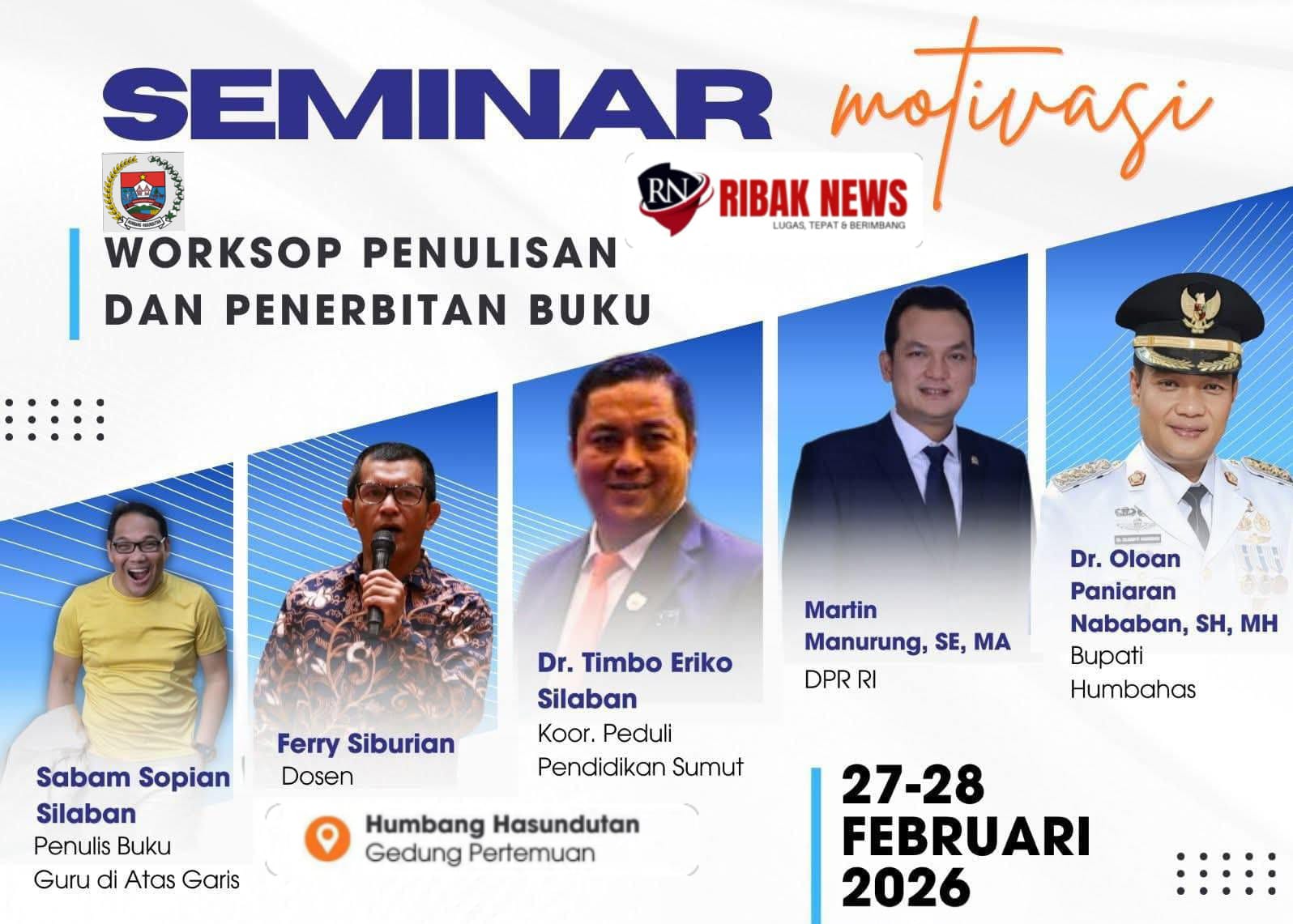 Komitmen membangun sumber daya manusia berbasis literasi kembali ditegaskan melalui penyelenggaraan Seminar Motivasi dan Workshop Penulisan serta Penerbitan Buku yang resmi dimulai Jumat (27/2/2026) dan berlangsung hingga Sabtu (28/2/2026) di Gedung Pertemuan Humbang Hasundutan.