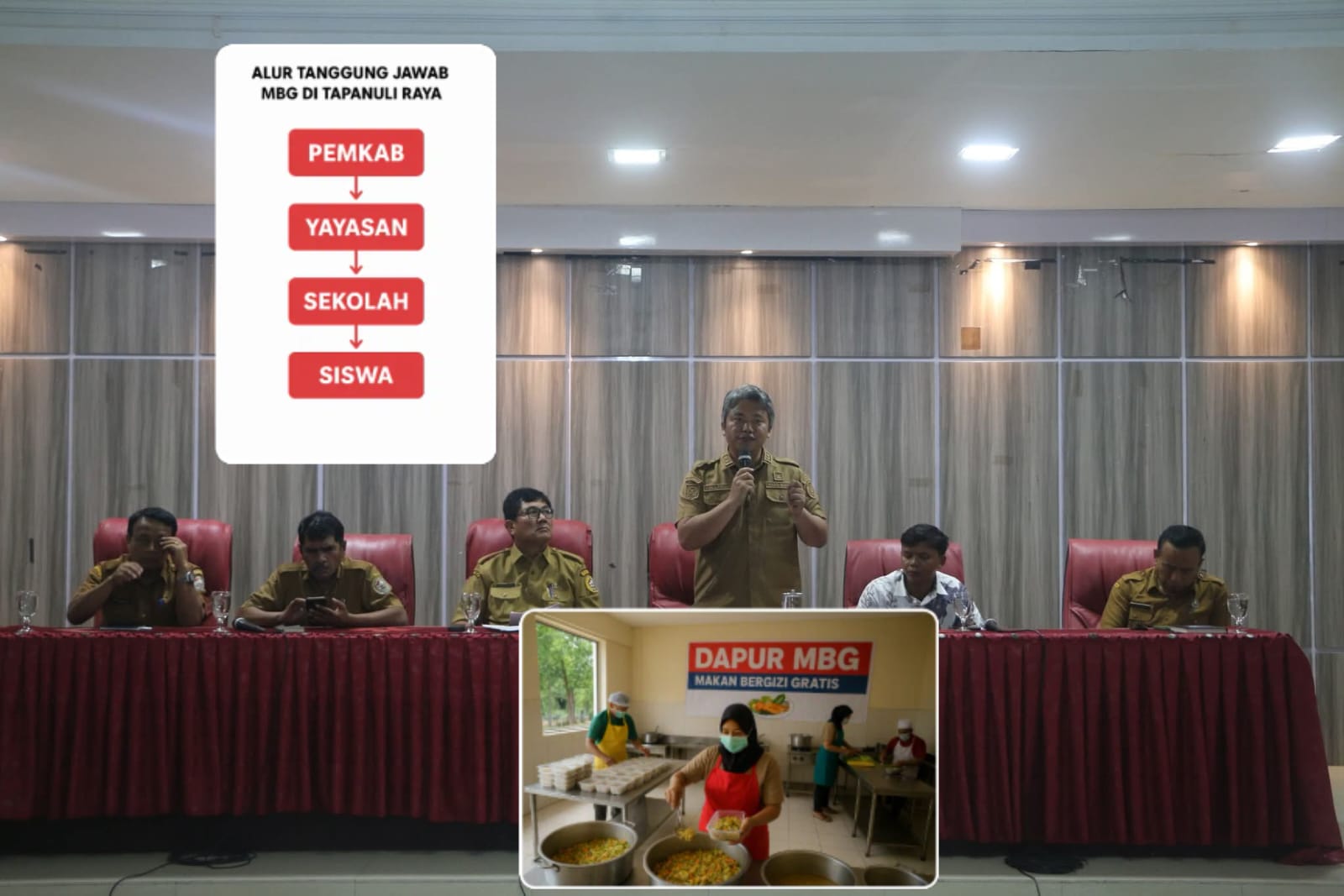 Rapat koordinasi ini dihadiri lintas sektor: OPD, Dinas Kesehatan, Dinas Pendidikan, Balai POM, ahli gizi, para camat, hingga perwakilan Unit Pelaksana Teknis (UPT). Dari eksternal hadir BPOM Toba Tumiur Gultom, Cabdis Wilayah IX Rudyanto Sinaga, perwakilan Yayasan Amandari Dwi, hingga pemilik dapur Jhonson Edy Simanjorang dan Estomihi Pasaribu.