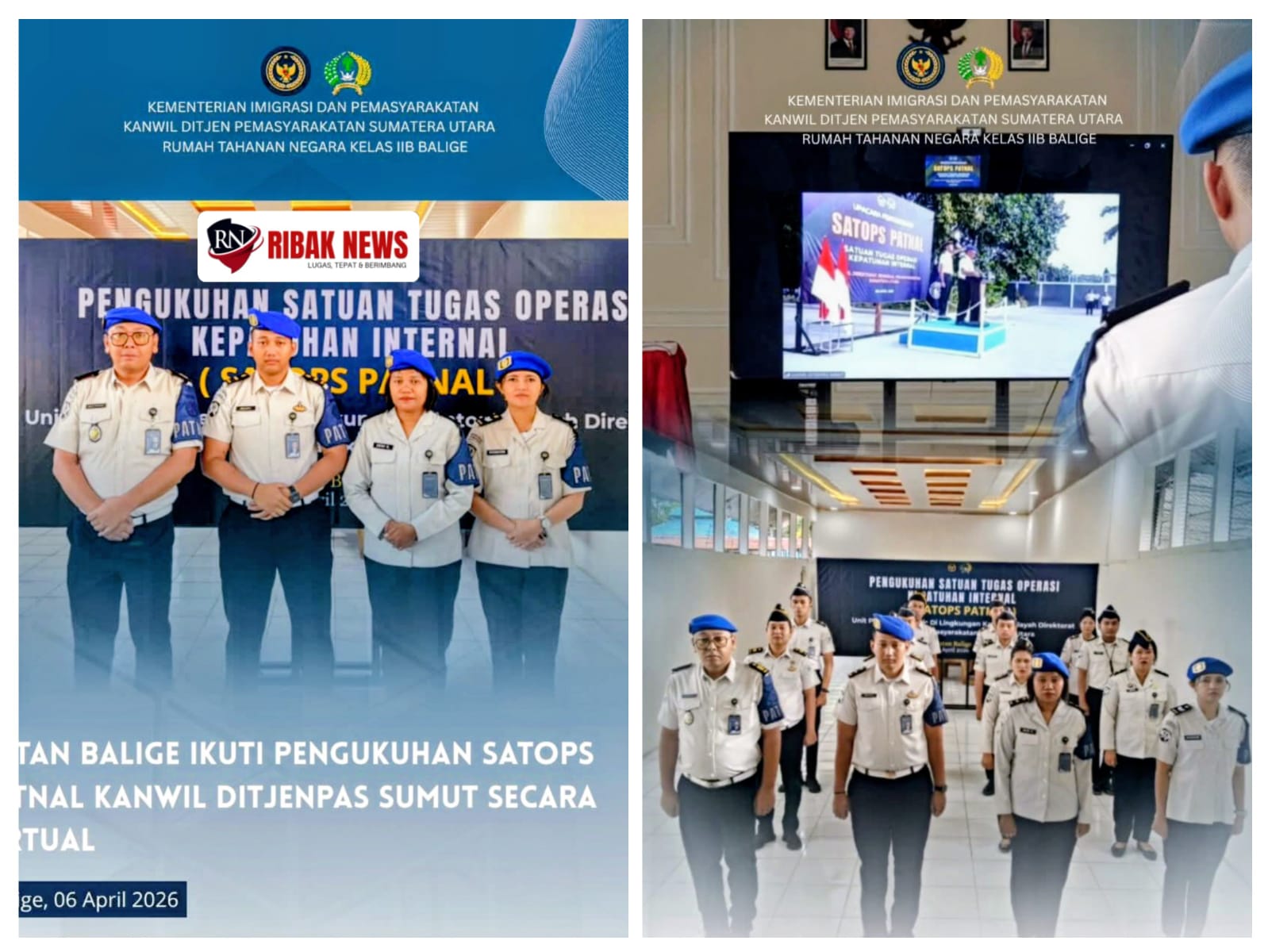 Rumah Tahanan Negara Kelas IIB Balige mengikuti kegiatan Pengukuhan Satuan Tugas Operasi Penegakan Kepatuhan Internal (SATOPS PATNAL) yang diselenggarakan oleh Kantor Wilayah Direktorat Jenderal Pemasyarakatan Sumatera Utara sebagai upaya memperkuat pengawasan dan integritas di lingkungan pemasyarakatan.