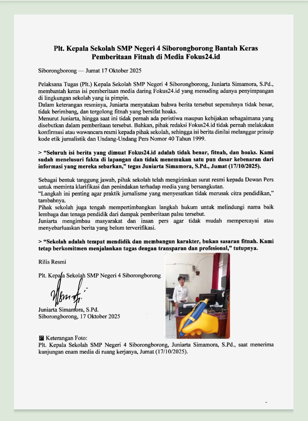 Pelaksana Tugas (Plt.) Kepala Sekolah SMP Negeri 4 Siborongborong, Juniarta Simamora, S.Pd., membantah keras isi pemberitaan media daring Fokus24.id yang menuding adanya penyimpangan di lingkungan sekolah yang ia pimpin.