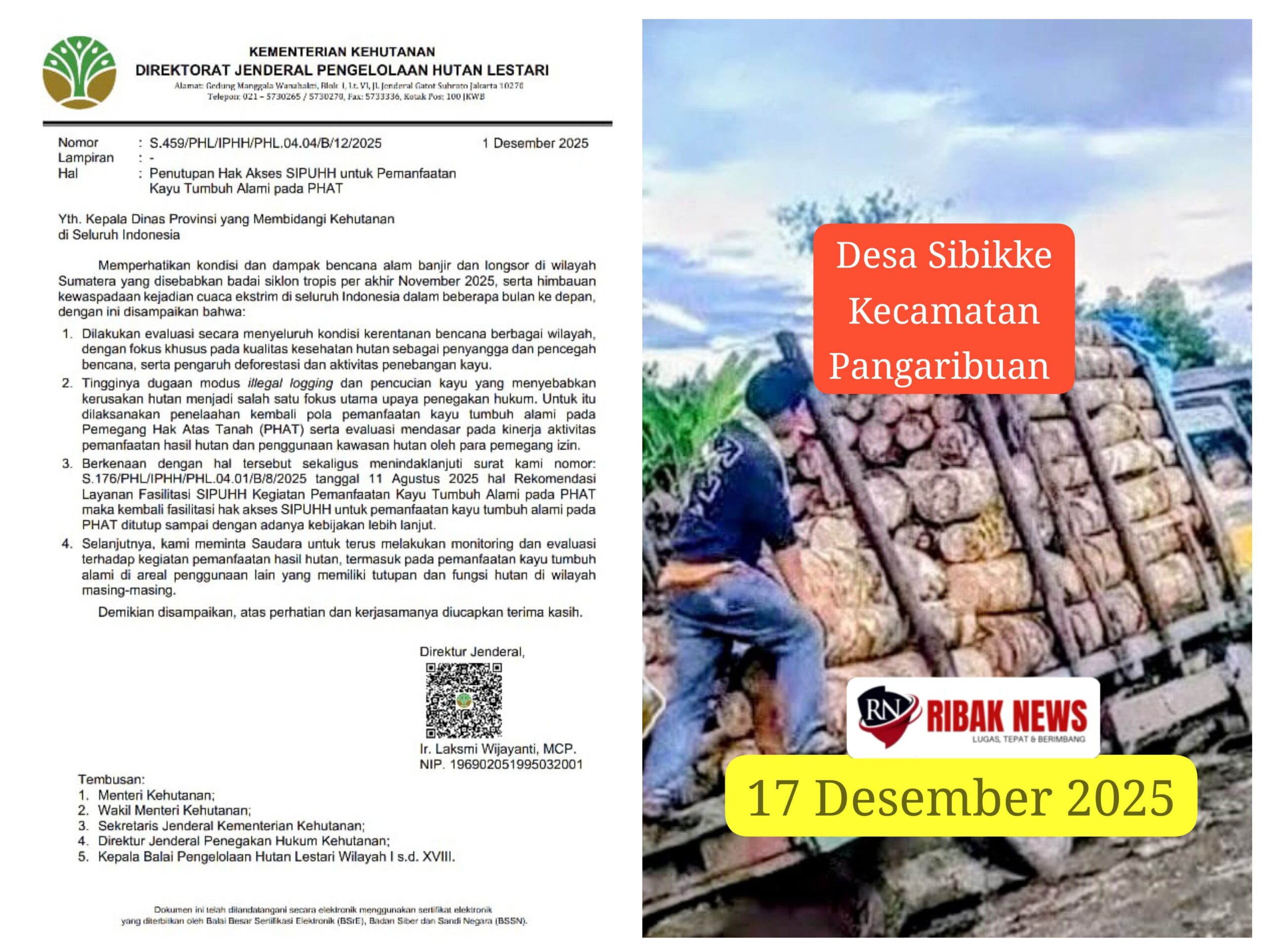 Sebagai dasar hukum, Kanit Tipiter turut menyampaikan Surat Direktorat Jenderal Pengelolaan Hutan Lestari Kementerian Kehutanan Nomor S.459/PHL/IPHH/PHL.04.04/B/12/2025 tertanggal 1 Desember 2025. Surat tersebut memuat kebijakan penutupan hak akses Sistem Informasi Penatausahaan Hasil Hutan (SIPUHH) serta pembekuan izin pemanfaatan kayu tumbuh alami pada PHAT hingga adanya kebijakan lanjutan.