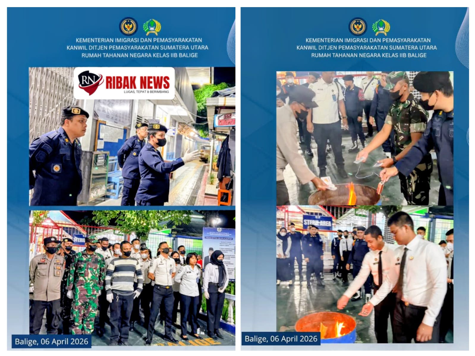 Dalam rangka memperingati Hari Bhakti Pemasyarakatan (HBP) ke-62 Tahun 2026, Rumah Tahanan Negara (Rutan) Kelas IIB Balige melaksanakan razia dan penggeledahan gabungan bersama aparat TNI dan Polri, Senin (6/4/2026) malam. Kegiatan ini menjadi bagian dari upaya peningkatan pengamanan sekaligus deteksi dini terhadap potensi gangguan keamanan dan ketertiban (kamtib) di lingkungan rutan.