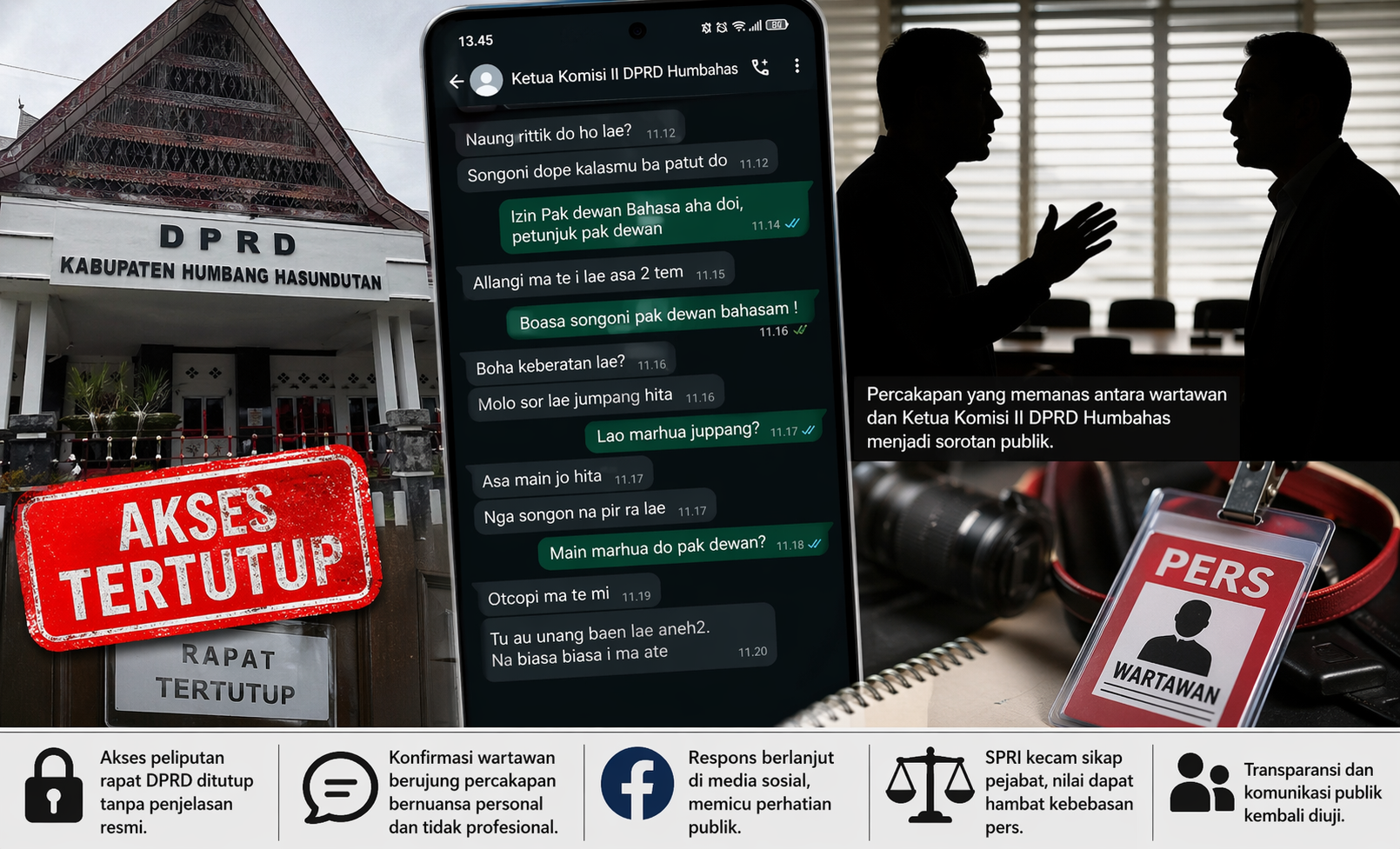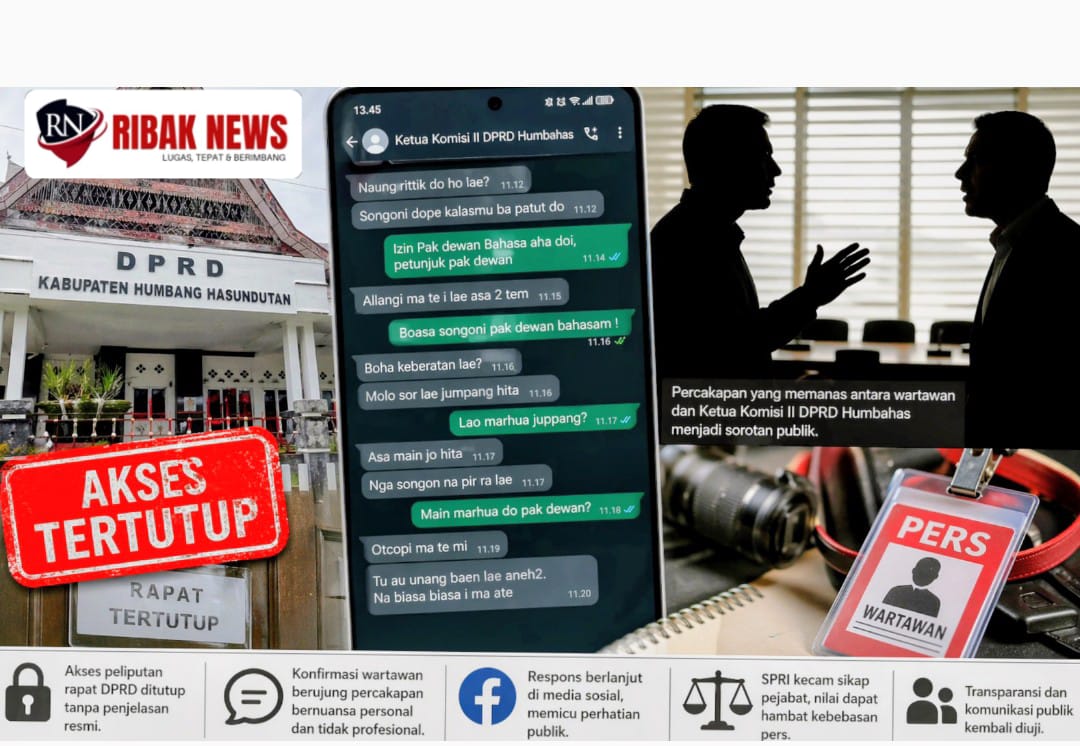 Polemik terkait transparansi rapat di lingkungan DPRD Humbang Hasundutan terus berkembang dan memasuki babak baru. Setelah dua pemberitaan sebelumnya memicu perhatian publik, kini muncul bukti percakapan langsung yang semakin memperkuat sorotan terhadap pola komunikasi pejabat publik dalam merespons kerja jurnalistik.