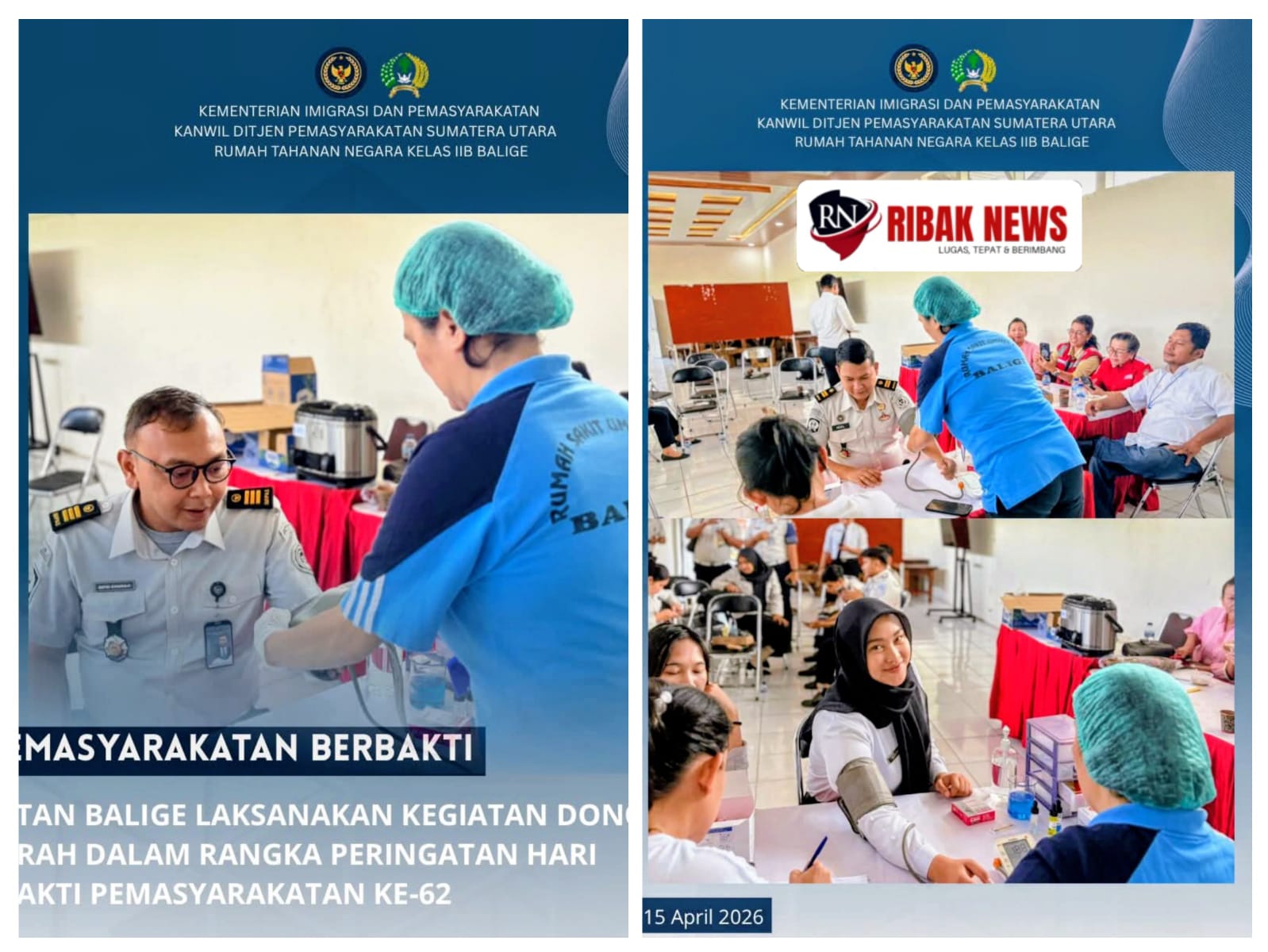 Dalam rangka memperingati Hari Bhakti Pemasyarakatan ke-62, Rumah Tahanan Negara (Rutan) Kelas IIB Balige menggelar kegiatan bakti sosial berupa donor darah, penyuluhan kesehatan, serta pemeriksaan dan pengobatan gratis bagi masyarakat. Kegiatan ini dilaksanakan sebagai bentuk nyata kepedulian sosial sekaligus pengabdian jajaran pemasyarakatan kepada masyarakat.