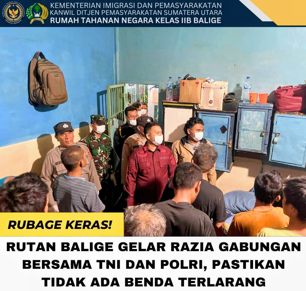 Rumah Tahanan Negara Kelas IIB Balige Kanwil Kemenkumham Sumatera Utara melaksanakan razia gabungan bersama personel Koramil 17/Balige dan Polsek Balige, Jumat malam (10/10). Kegiatan ini sebagai langkah preventif mencegah peredaran benda terlarang di blok hunian warga binaan.